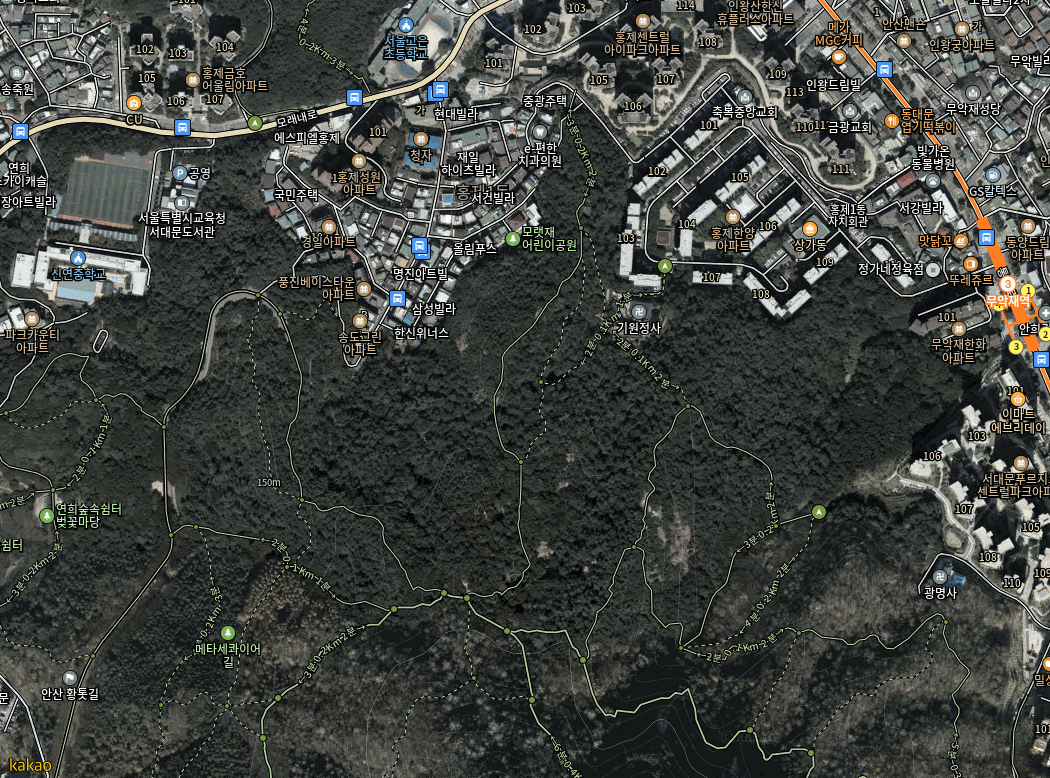 10km · 7 약수터 · 5 테마 구간. 도심의 숲 순회.